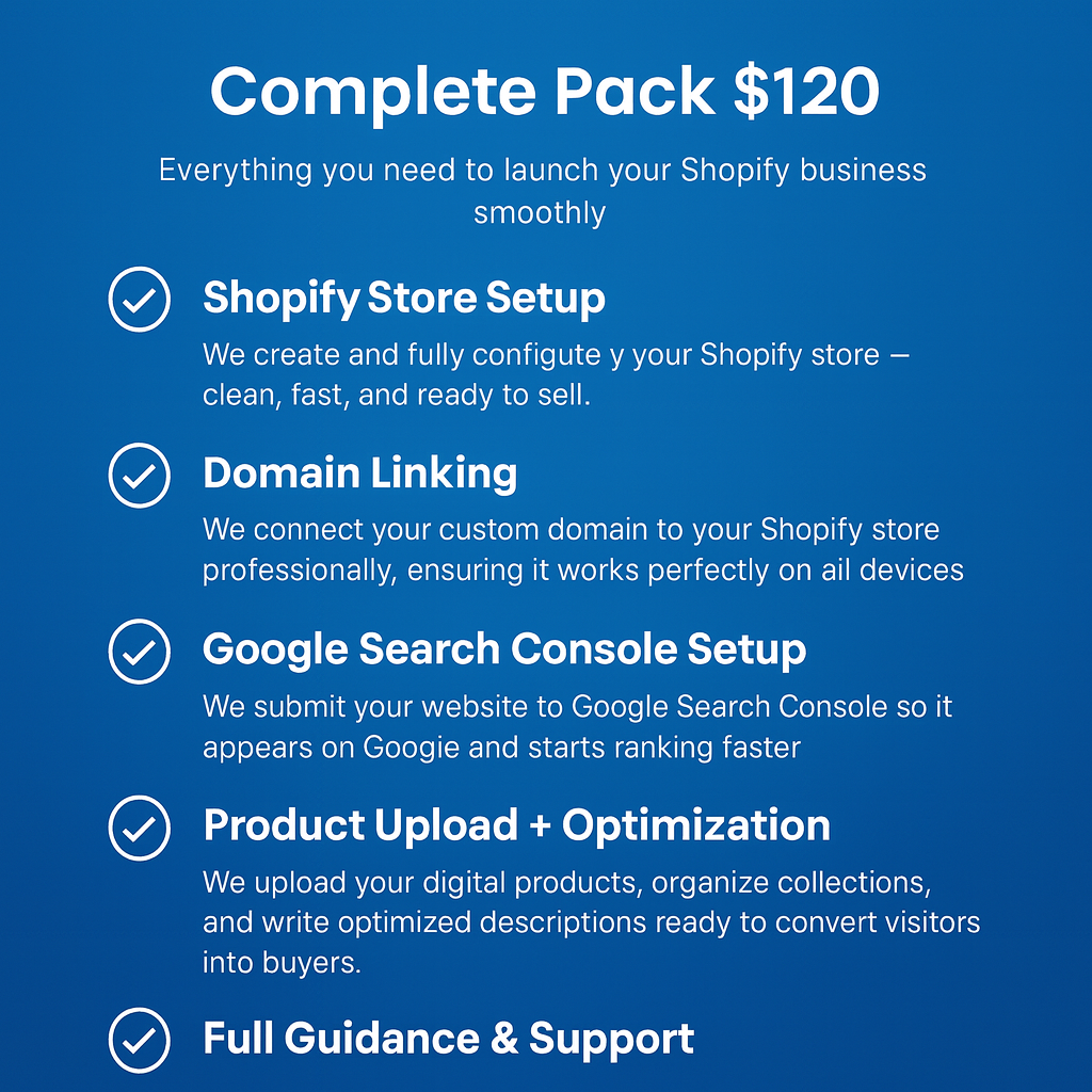 Get a full-value pack designed to help you launch your Shopify store professionally and in the shortest time possible. This offer gives you all the essential steps you need to start your business with confidence — from setting up your store and connecting your domain to improving your visibility on Google.